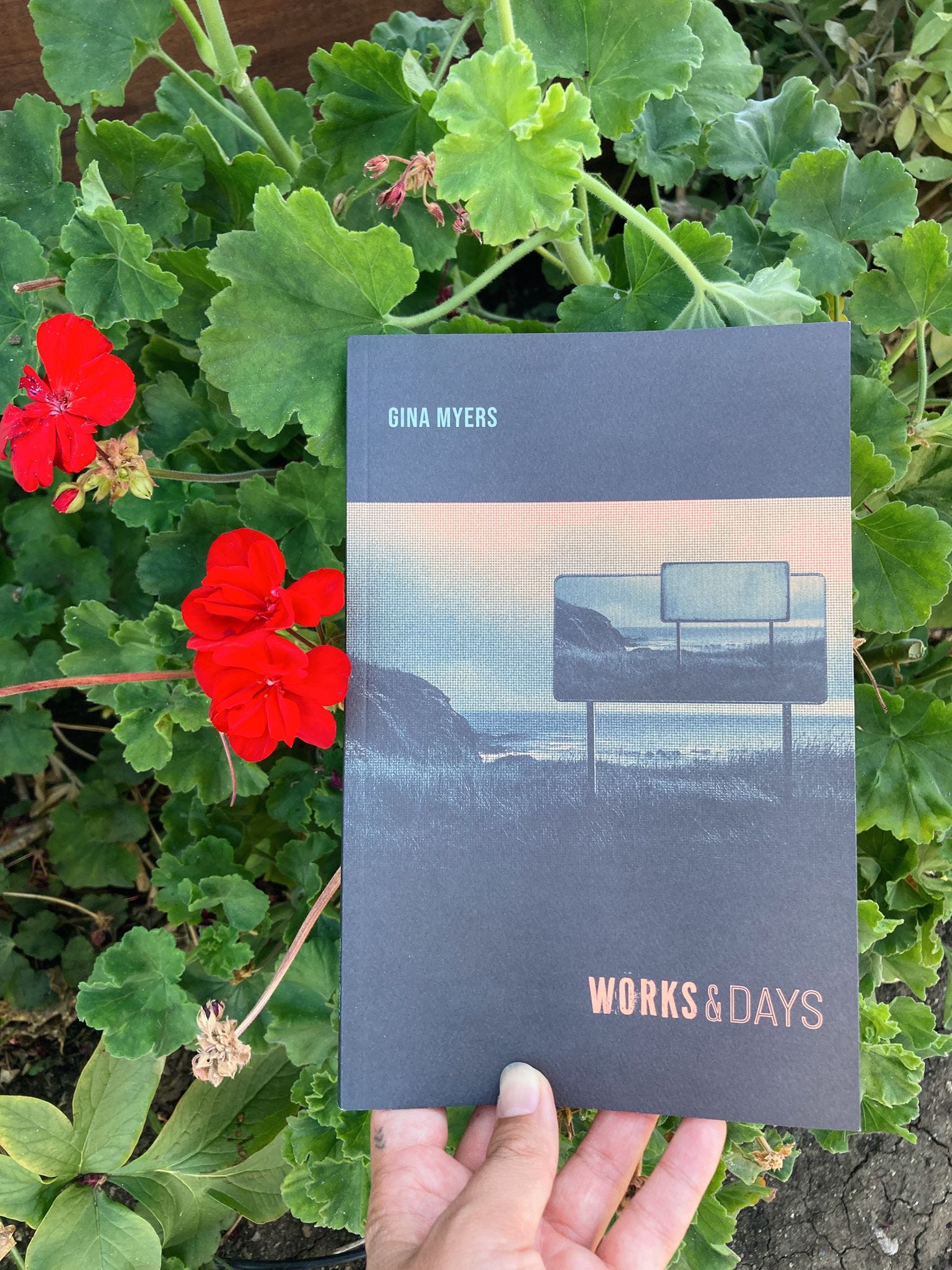 Gina Myers’ brand new poetry collection, Works & Days, from one of my favorite small presses, the Philadelphia-based Radiator Press. When I got my preordered copy in the mail I read it all in one sitting. This is absolutely what I needed to read, especially as I am dealing with some high-stress work-related things in my life currently. I love Gina’s pop culture references to critiques of toxic workplace cultures under capitalism, from Dolly Parton to The Twilight Zone to Aliens. Her workplace testimonies. Her sharpness, wit, and subtle humor. Her assertions that we all deserve better than this. This is a book that needs our attention and demands it.